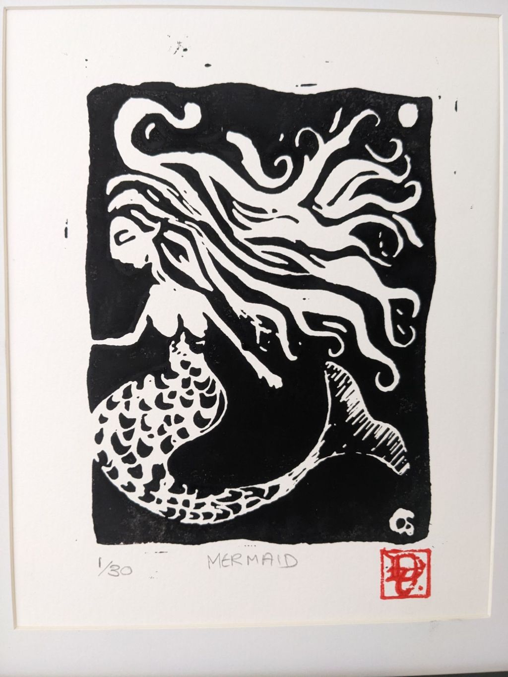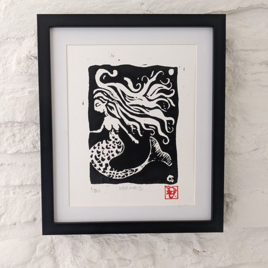 This print carries the raw, direct energy I love in lino work. There’s something about the medium that suits these old tales perfectly. The bold contrasts, the carved texture, the way the ink sits differently on each print—it all feeds into that handmade, folkloric quality.