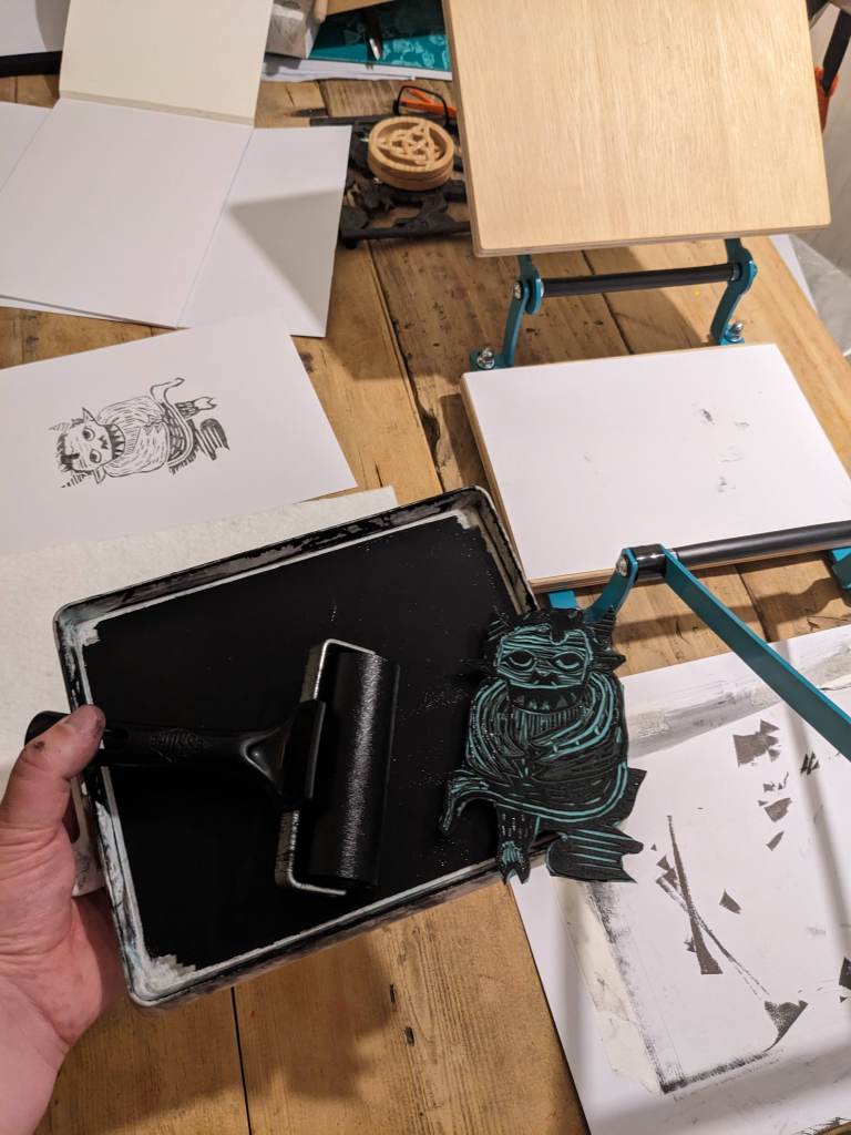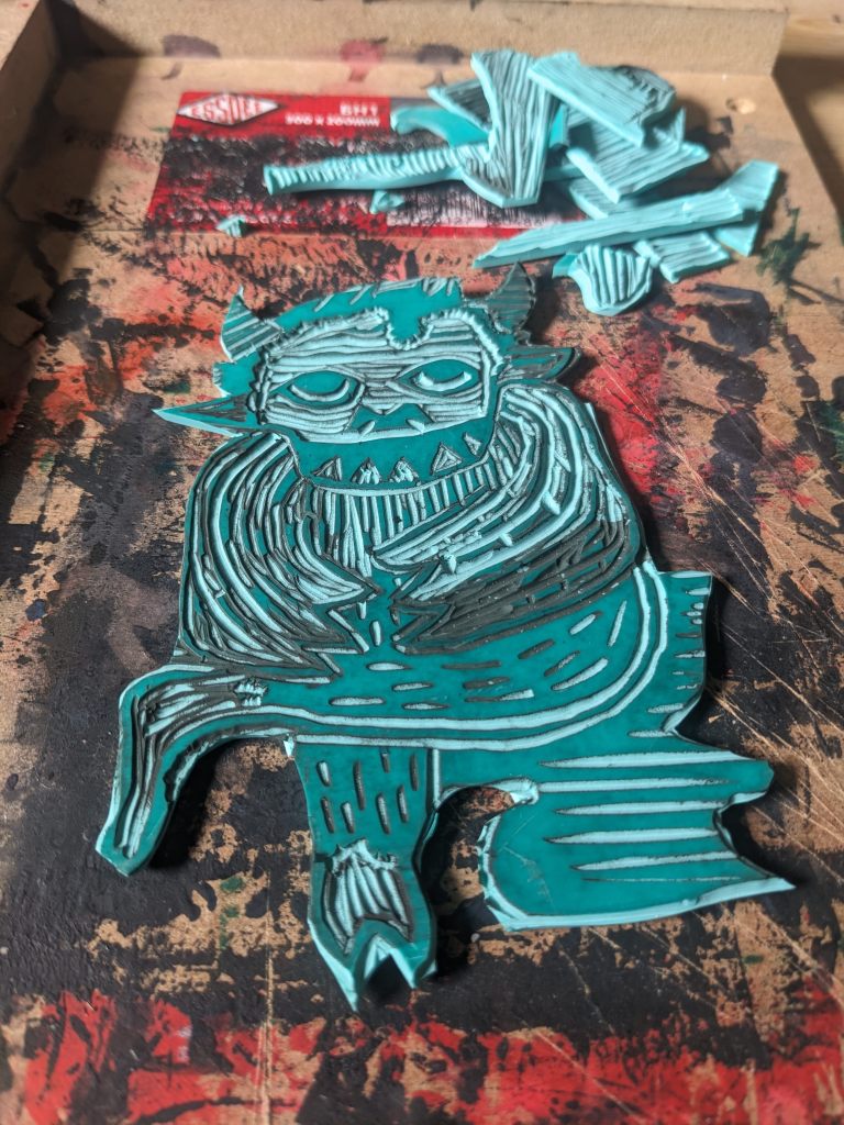 Eventually, he found his way out and onto a lino block. Stone was a bit much for me.
