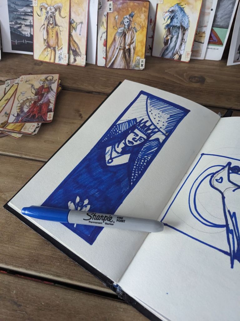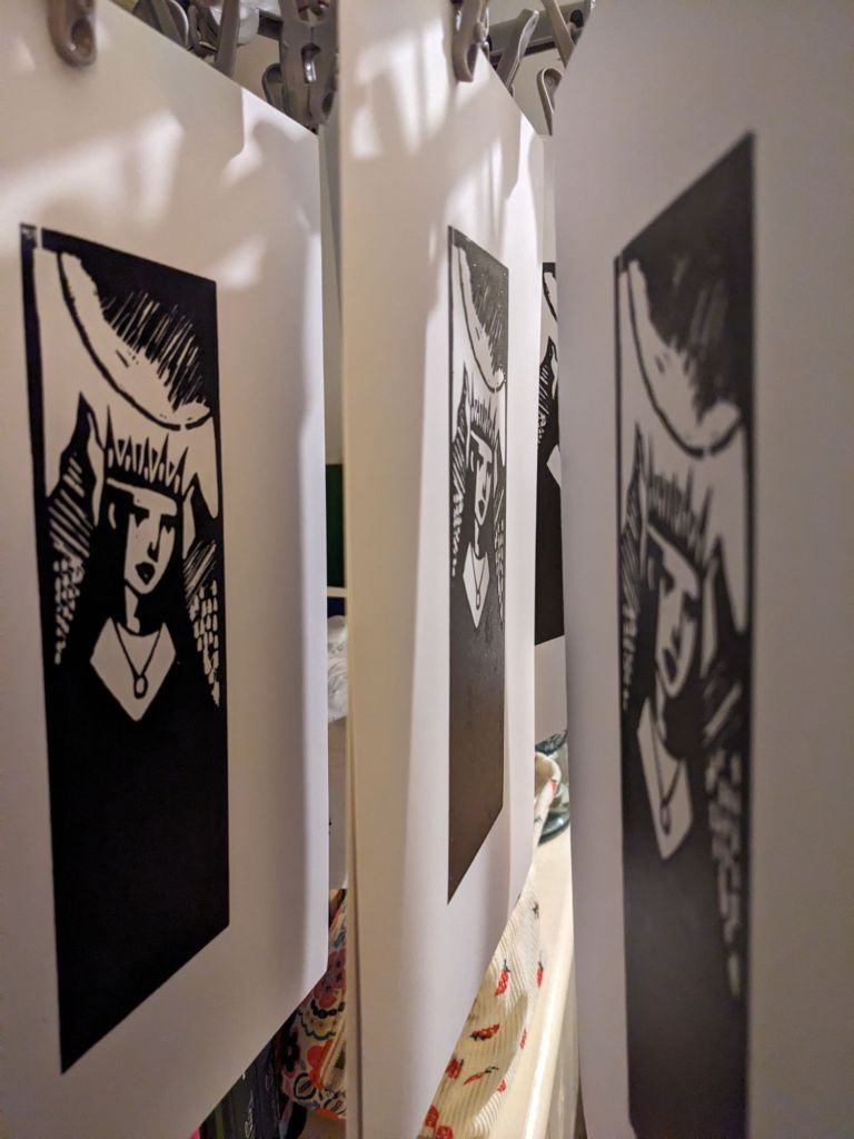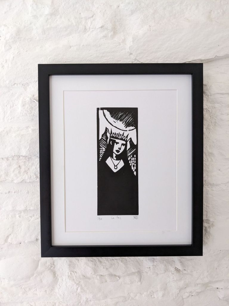However once the block was inked and the final image came out, she had become this darker, powerful force, much like the cycle of Morgan le Fay herself. The process of carving and printing had transformed the initial vision into something more complex, more ambiguous.