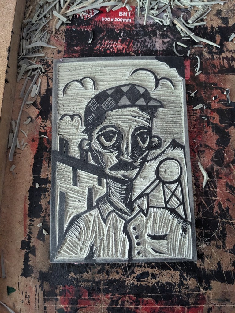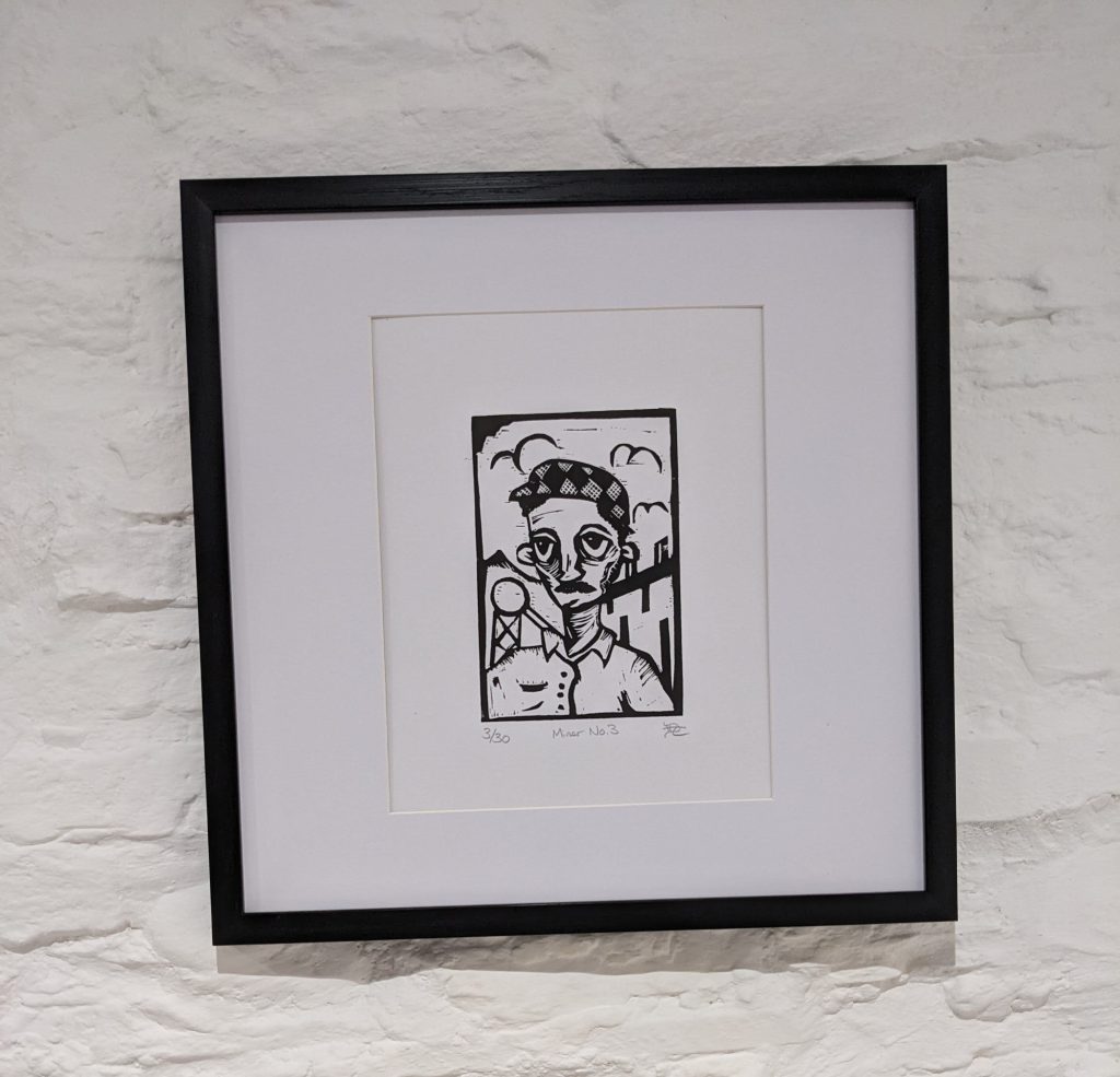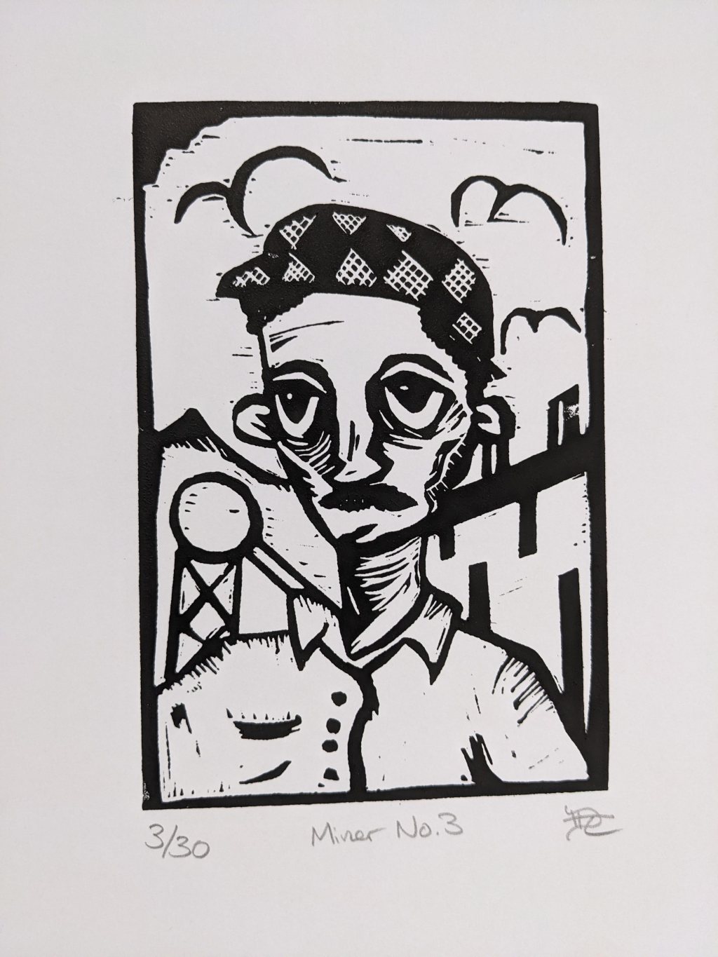 Miner No.3 measures 105 x 148 mm, part of an ongoing limited edition series exploring the faces of South Wales mining communities. Each print is hand-carved, every line deliberately placed to capture not heroic mythology, but the quiet dignity of men shaped by the systems they served.